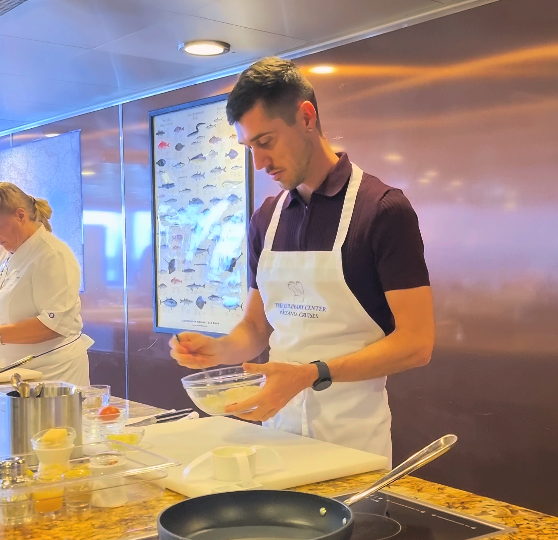 A standout for me was the Culinary Centre. These small-group cooking classes (for an additional fee) were a real highlight. Ours focused on Italian dishes inspired by the Riviera’s heritage, along with an Alaskan-themed dessert. Wine pairings were included, and yes – we got to eat everything we cooked. It was fun, unique, hands-on, and most importantly, delicious.