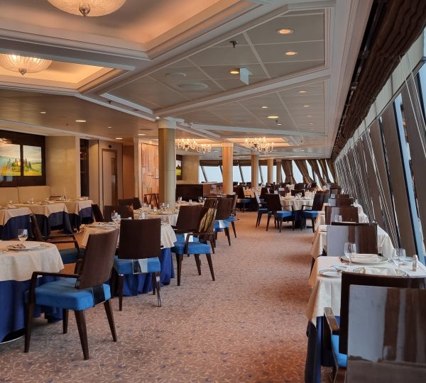 The main dining room was elegant and sophisticated. Unlike some cruises, there’s no fixed dining time – you’re encouraged to dine when and where you like. The Grand Dining Room is open for breakfast, lunch, and dinner, offering a formal atmosphere with ever-changing menus and a great variety of cuisine.